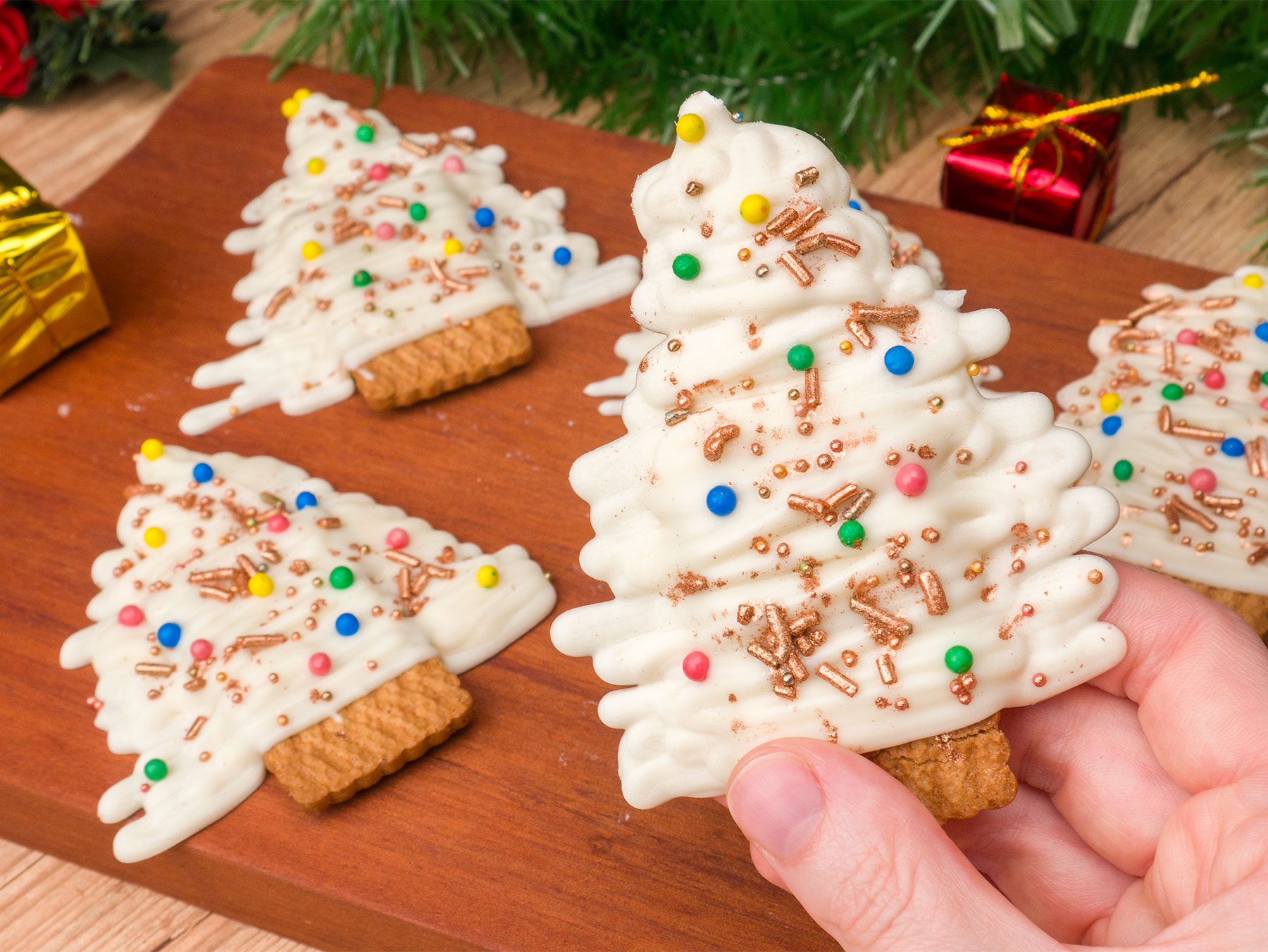 - Faça movimentos de vai e vem sobre o biscoito para fazer o desenho da árvore