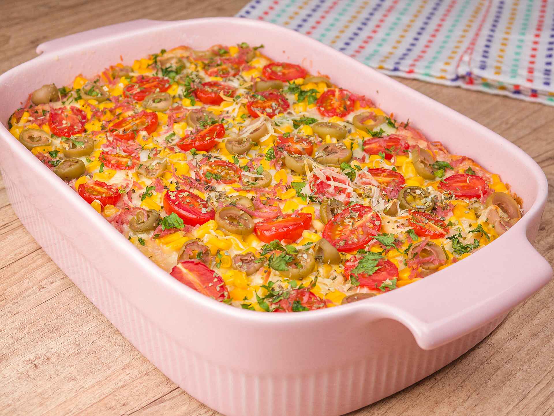 Presunto, muçarela, milho, tomates, azeitonas, salsinha e orégano. Leve ao forno pré aquecido a 200ºC e deixe por cerca de 40 minutos.