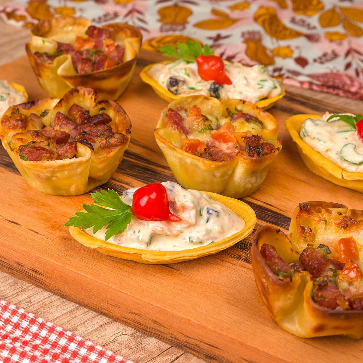 Recheie as barquetes e decore com salsinha e pimenta biquinho em conserva