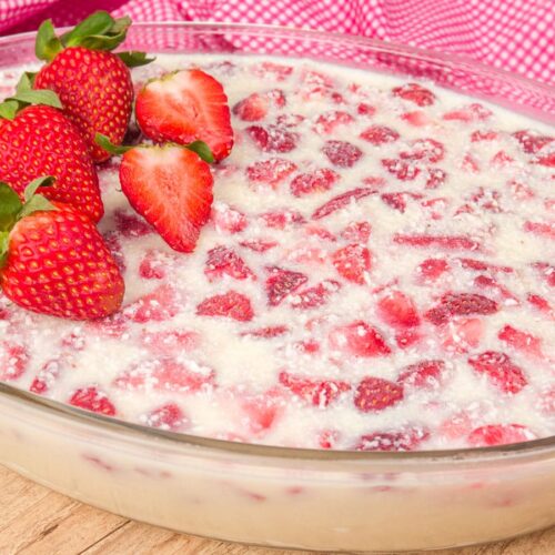 Pegue um refratário oval de 21cm x 30cm e despeje todo o líquido delicadamente e por cima coloque todos os morangos picadinhos