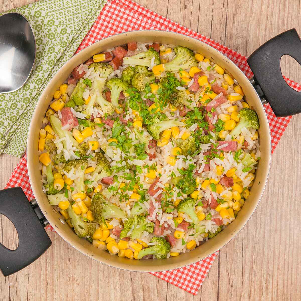 Quando a água reduzir pela metade junte o brócolis e o milho verde e tempere com pimenta do reino