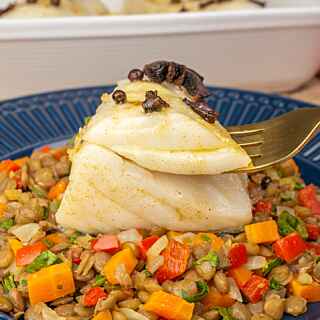 Sirva a lentilha no prato e por cima o lombo de bacalhau