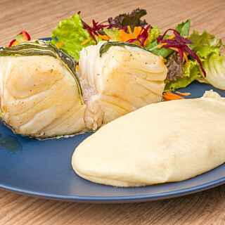 Sirva o bacalhau dourado na manteiga com sálvia acompanhado do aligot e junto com uma salada de folhas, cenoura ralada, beterraba ralada