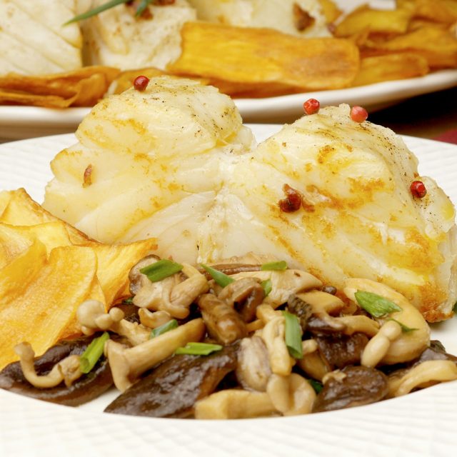 Como fazer Bacalhau Grelhado na Manteiga de Garrafa com Chips de Mandioca e Cogumelos