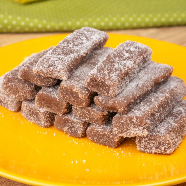 Depois deste tempo, unte uma faca com óleo e corte no formato desejado e passe no açúcar refinado