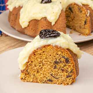 Desenforme o bolo e decore com o beijinho e as ameixas secas
