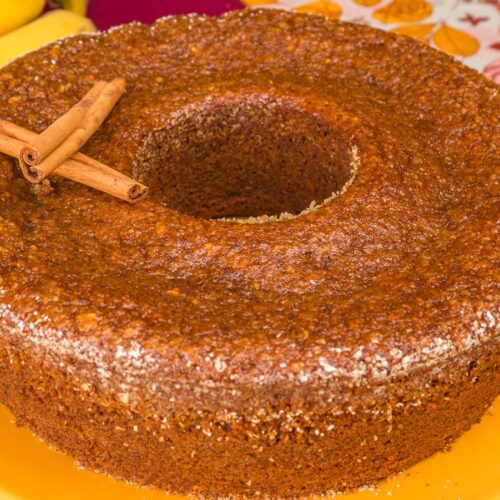 Despeje em forma redonda de furo central (a que utilizei tem 23 cm de diâmetro e 9 cm de altura) untada com óleo e com uma mistura de farelo de aveia (1 colher de sopa) e 1 pitadinha de canela em pó