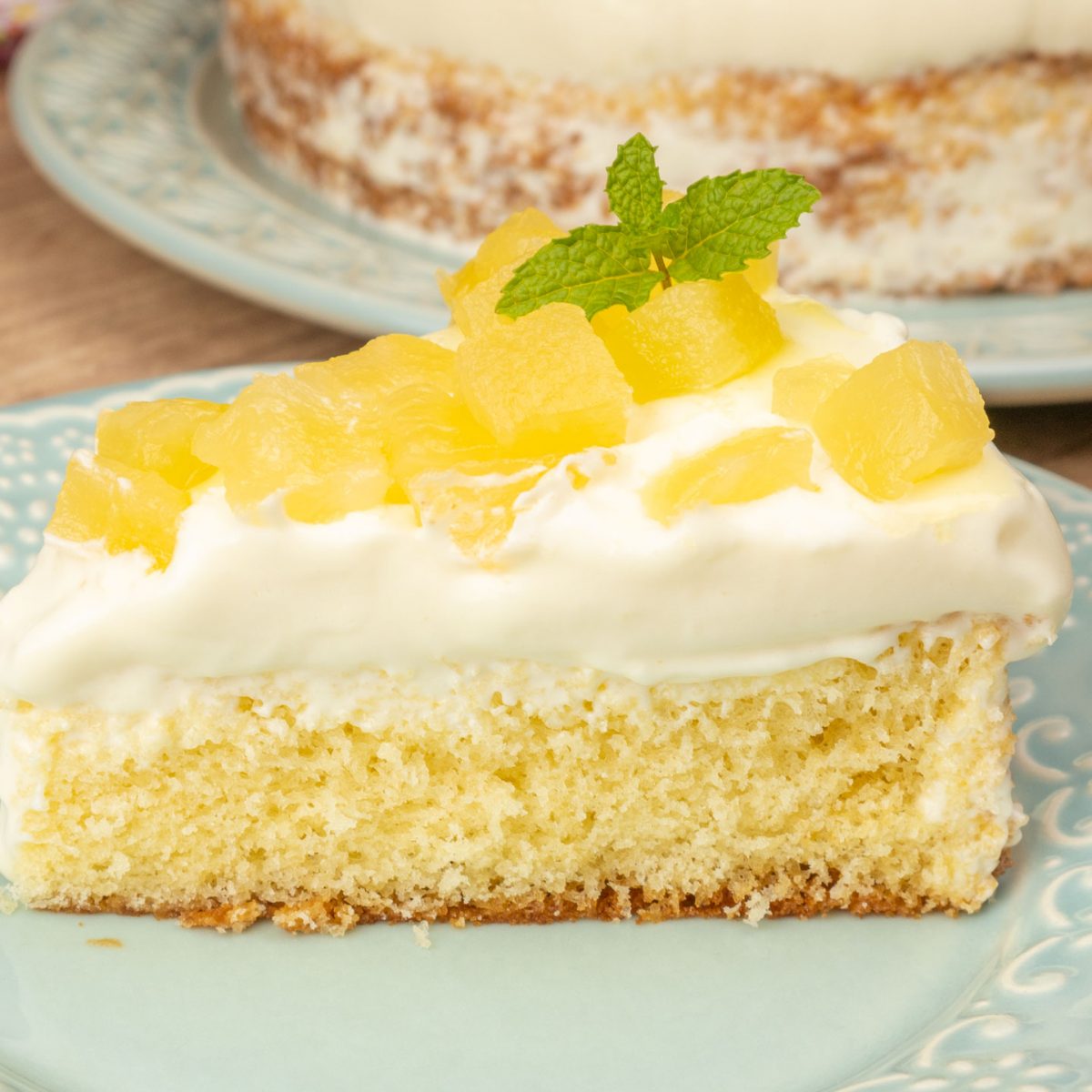 Transfira o bolo mousse de abacaxi para um prato e espalhe a calda mais fria por cima para dar uma cor