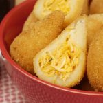 Misture o amido de milho na água e mergulhe as coxinhas rapidamente