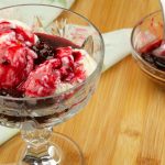 Boleie o frozen com uma colher de sorvete e sirva com a calda de amora por cima