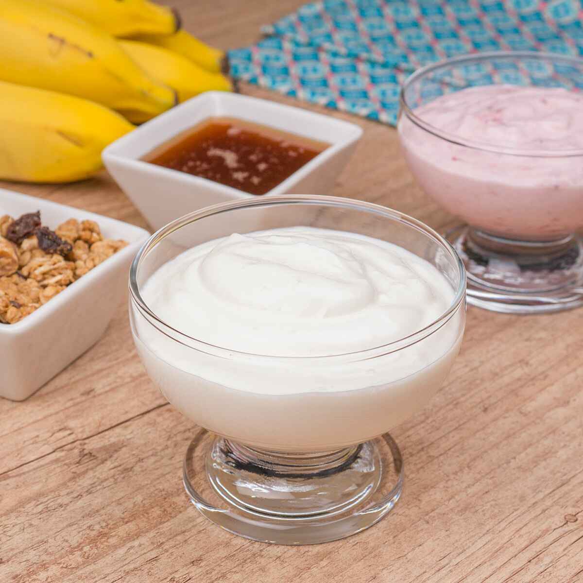 Agora coloque o iogurte natural, o qual não pode estar muito gelado, importante tirar da geladeira 15 minutos antes