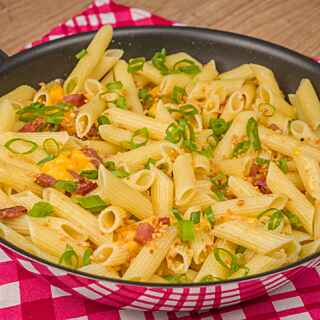 Desligue o fogo e junte o macarrão cozido e finalize com o queijo picado e a cebolinha picada