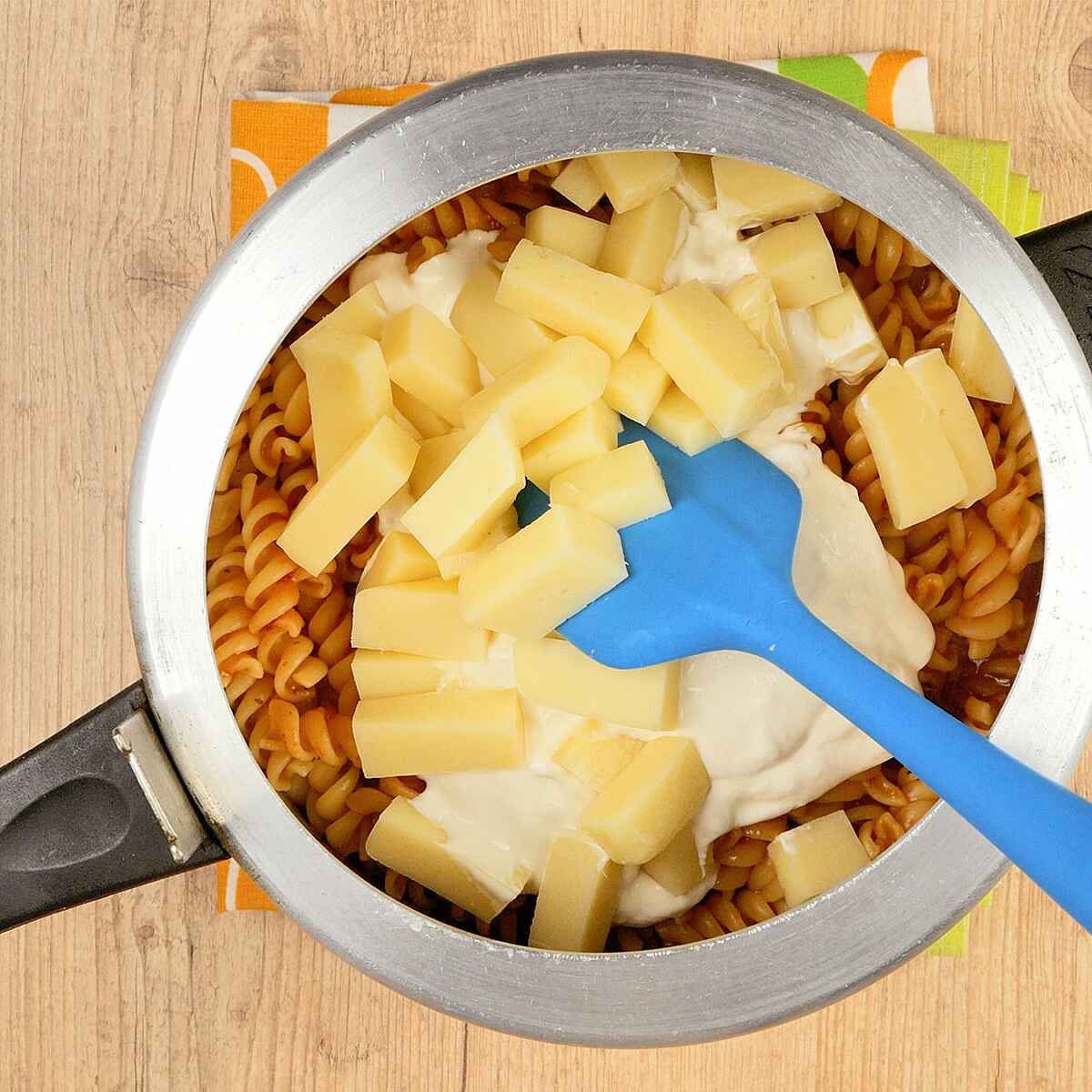 Abra a panela e acrescente o creme de leite e o queijo muçarela