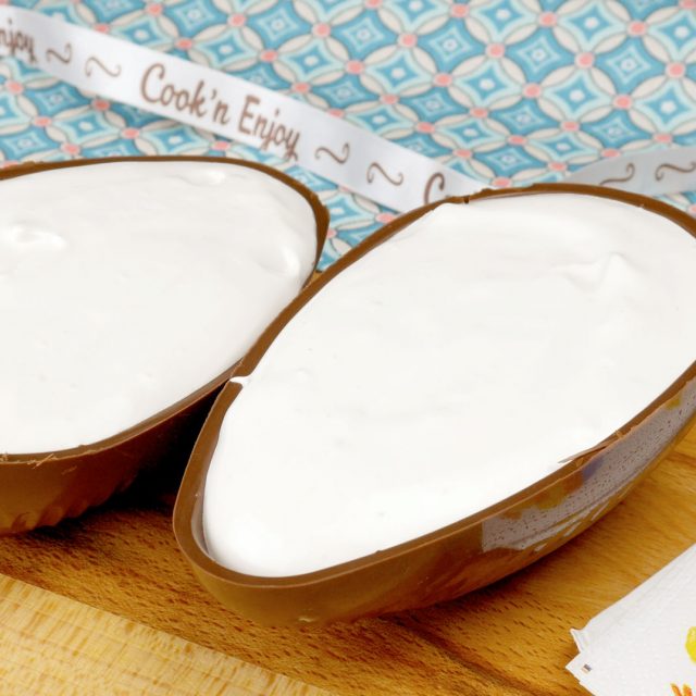 Pegue uma forma de ovos de 250g e preencha de chocolate com crocante até a marcação