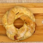 Pegue uma forma untada e enfarinhada e transfira o pão (utilizei uma de 26cm de diâmetro)