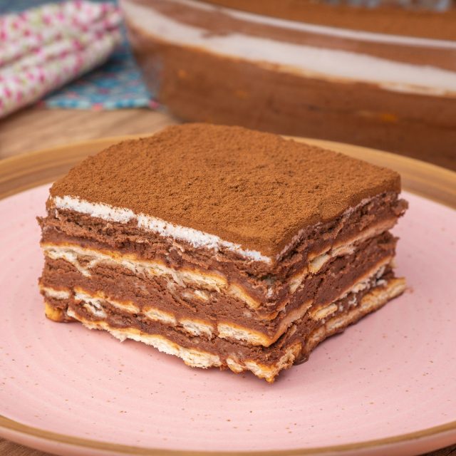 Depois deste tempo espalhe por cima o chantilly batido que estava reservado e nivele bem, polvilhe cacau em pó