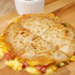 Por cima coloque um pouco do queijo prato (é importante não colocar muito nas bordas, pois pode escorrer muito para fora), o tomate picado, o milho, a cebolinha e feche com a outra tortilla