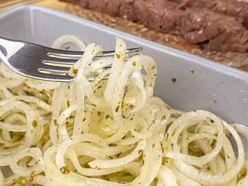 Deixe de molho por 20 minutos para que a acidez da cebola saia e ela ainda se mantenha crocante