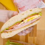Coloque no pão o presunto com o queijo, depois o ovo, o tomate, as folhas de alface e feche com a outra fatia de pão