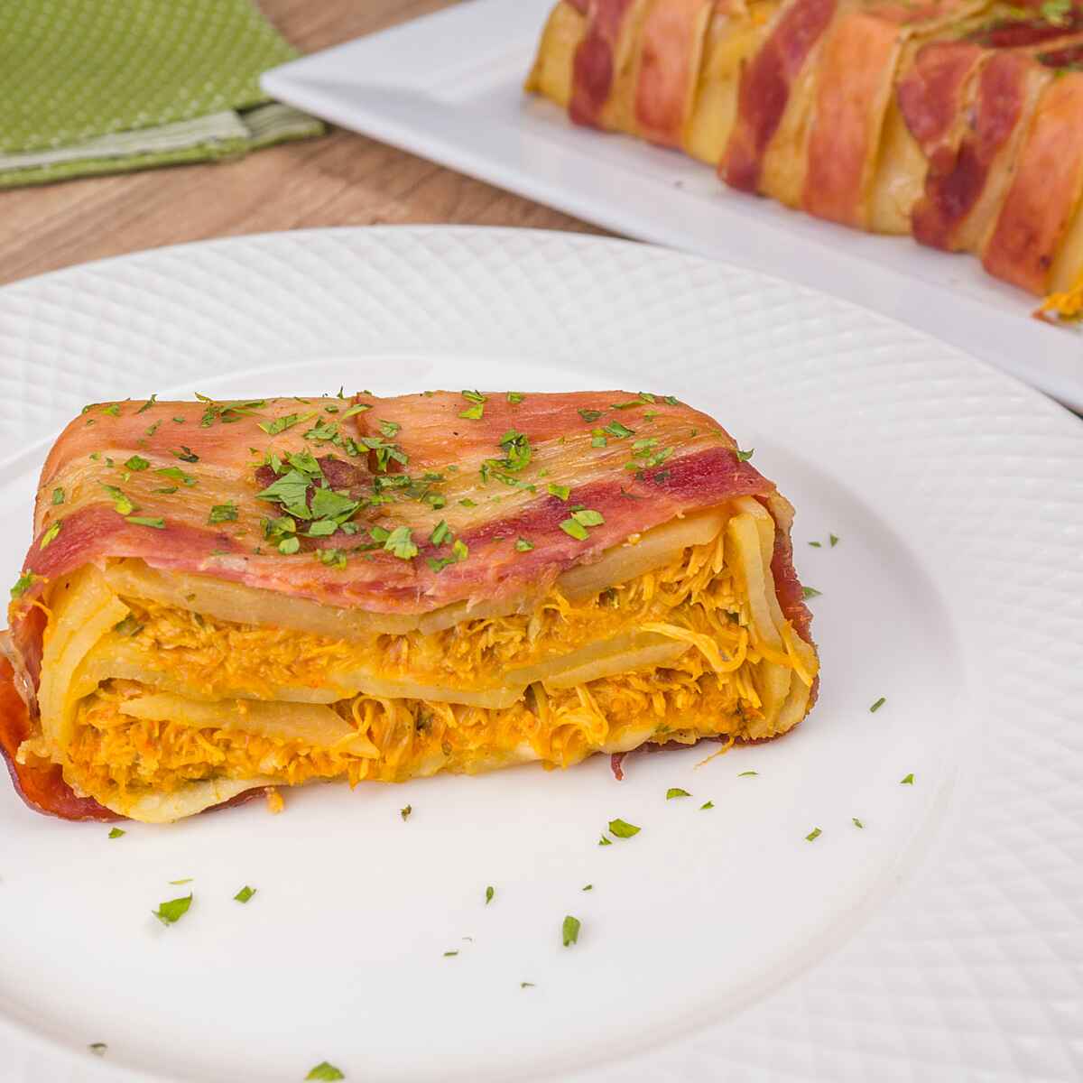 Faça mais uma camada com as fatias de batata e dobre a pontinha do bacon pra dentro
