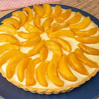 Desenforme a massa, coloque o recheio e decore com o pêssego fatiado